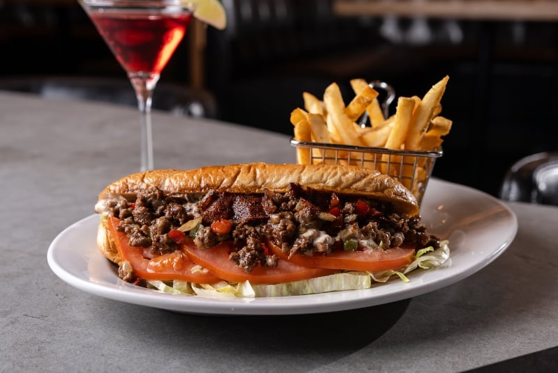 ground beef, peppers & onions, cheddar & american cheeses, shredded lettuce, tomato and house sauce on a hoagie roll; served with fries - $18.00