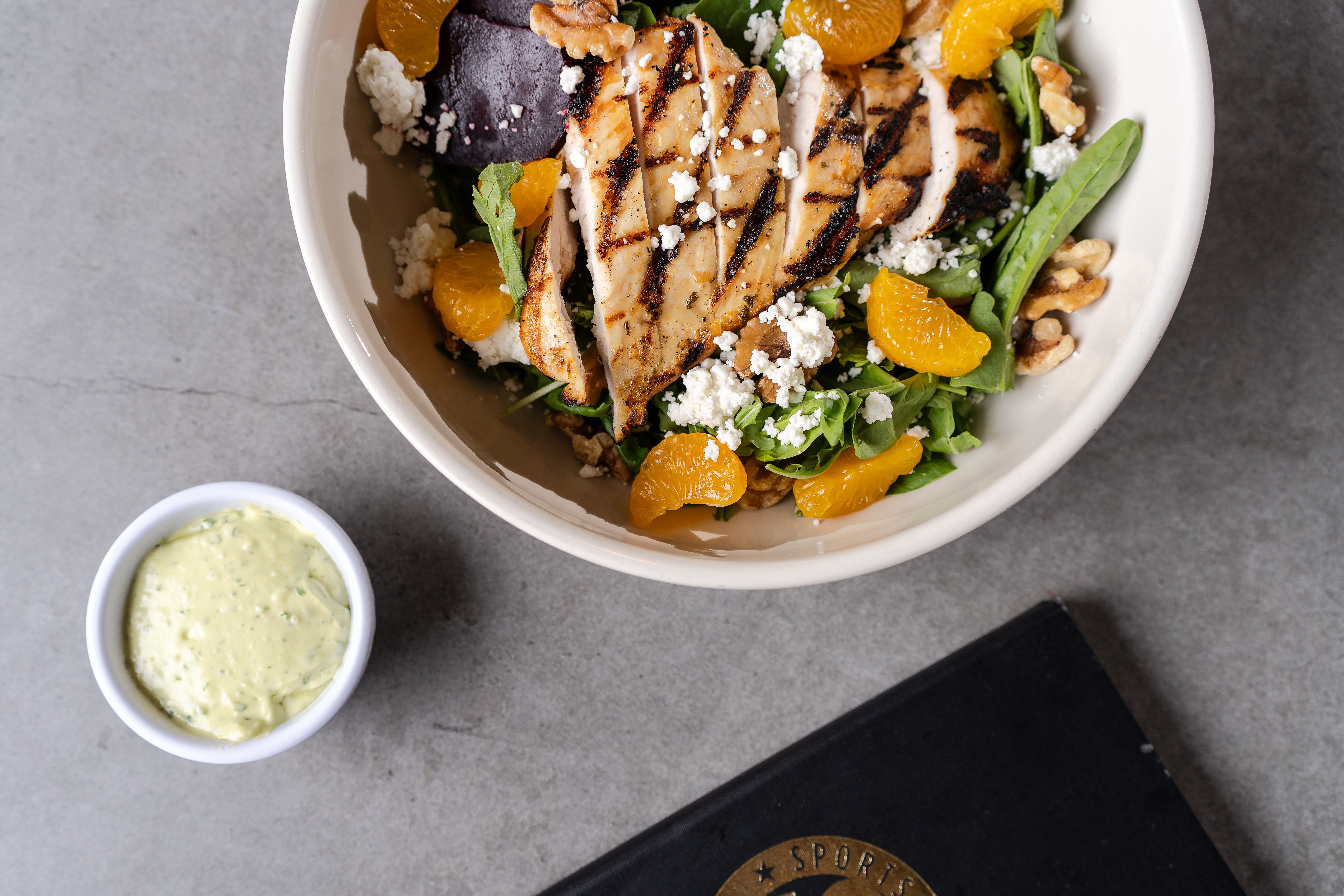 Mixed greens, goat cheese, oranges, candied walnuts, roasted beets, grilled chicken breast, creamy avocado lime dressing $19